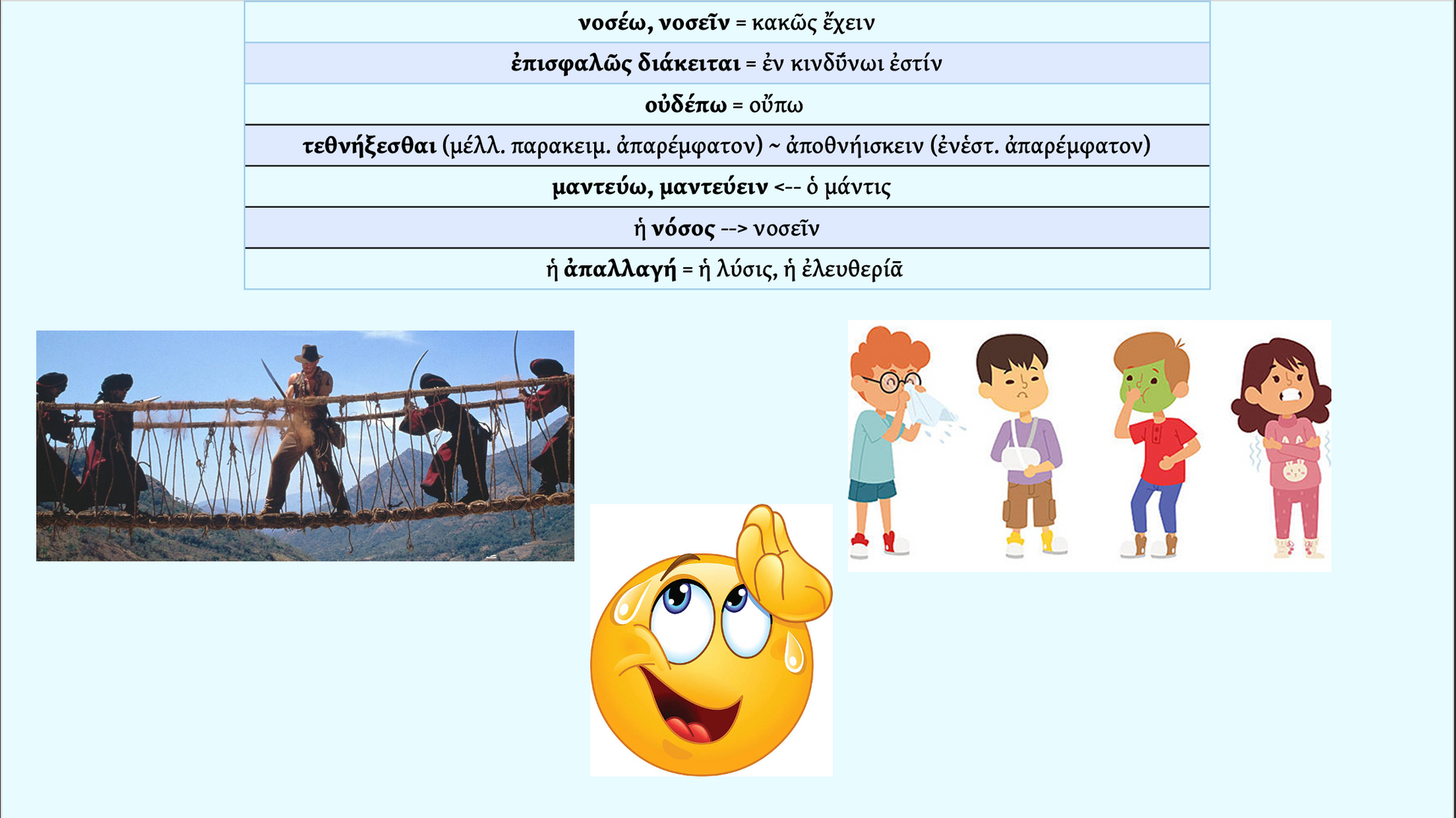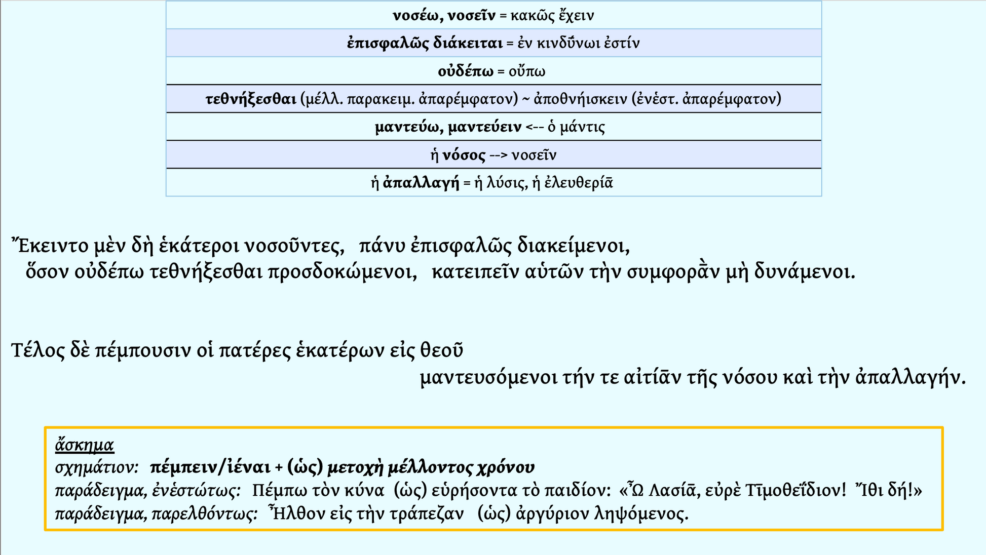 This type of formula, διακεῖσθαι + adverb, occurs frequently in the text and in Ancient Greek prose at large, and doesn’t pose a great challenge in comprehension. But have you ever uttered this phrase yourself? That’s what we will do in class! Based upon this formula, we will create our own phrases based on the formula and take turns speaking them aloud: